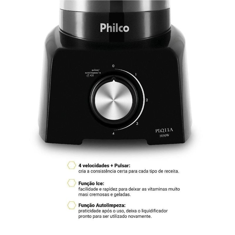 Liquidificador Philco PLQ11A - Deixa suas receitas muito mais fáceis de preparar! PotênciaO Liquidificador Philco PLQ11A combina potência e praticidade que tornam o dia a dia na cozinha muito mais prático e saboroso. Com a 1050W e 4 velocidades, ele garante desempenho superior para triturar ingredientes diversos, inclusive gelo. Jarra de 1,5LSua jarra em plástico SAN possui capacidade total de 2,7L e 1,5L de capacidade útil, para sucos, vitaminas e outras receitas do dia a dia. Conta ainda com filtro para sucos integrado, que separa sementes e bagaço, deixando a bebida mais saborosa.Função Pulsar e AutolimpantePara facilitar a rotina, o modelo possui função pulsar, sistema autolimpante e porta-fio integrado, além de lâminas em aço inox que oferecem durabilidade e eficiência no corte. Seguro, moderno e com design em preto, é a escolha perfeita para sua cozinha.Descubra mais produtos Philco e garanta mais praticidade e agilidade na sua rotina!