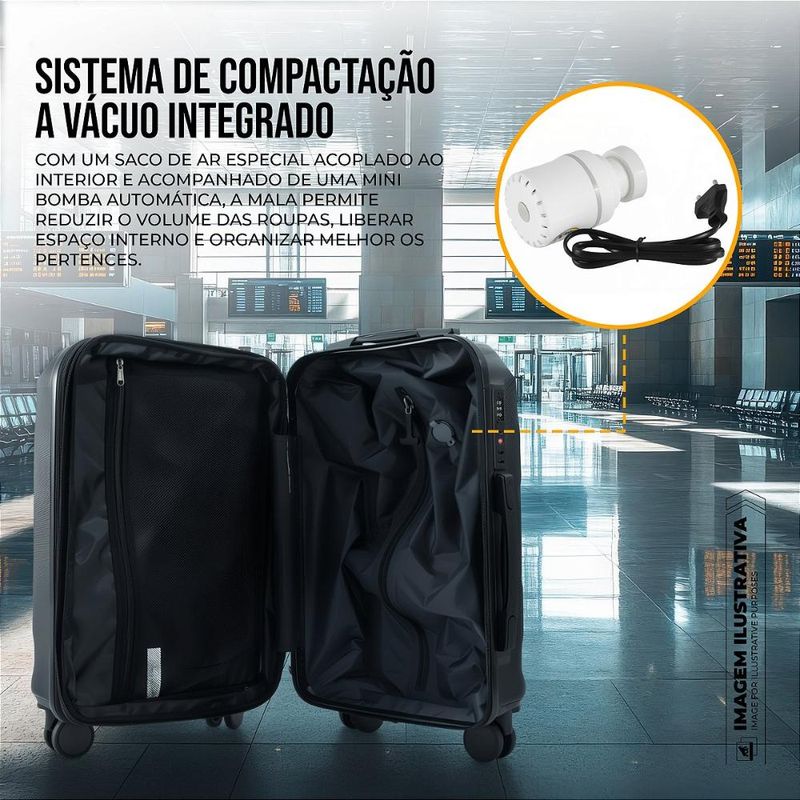 O grande diferencial da Survivor está no seu sistema de compactação a vácuo integrado, que já vem embutido na mala. Com um saco de ar especial acoplado ao interior e acompanhado de uma mini bomba automática, a mala permite reduzir o volume das roupas, liberar espaço interno e organizar melhor os pertences. Diferente de soluções externas, esse sistema faz parte da própria estrutura da Survivor, garantindo praticidade imediata: basta acionar o mecanismo para compactar e otimizar cada centímetro do espaço disponível. Isso significa que você pode levar muito mais dentro de uma mala de bordo, sem perder conforto e mobilidade.