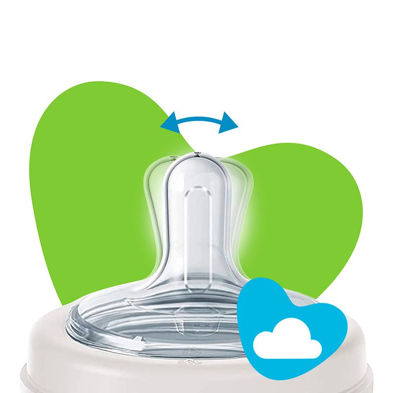 O bico redondo em silicone flexível contém uma área maior de apoio. Sua tampa antivazamento fecha de forma eficaz e mantém o bico protegido durante o transporte. Livre de BPA.