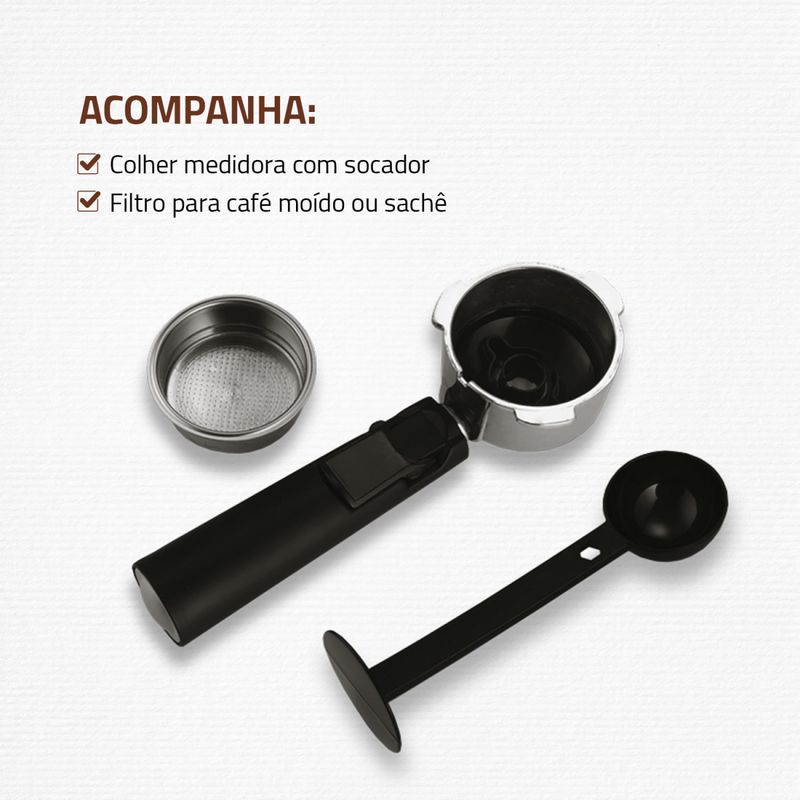 ACOMPANHA ACESSÓRIOS: A cafeteira vem com uma colher medidora com socador, para dosar a quantidade de pó e condensá-la, e um filtro para café moído ou sachê.