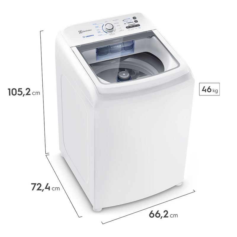 Qual é o tamanho de uma máquina de lavar 15 kg? O tamanho das lavadoras pode variar entre os modelos. A máquina de lavar Electrolux 15 kg, por exemplo, apresenta 105,2 cm de altura, 66,2 cm de largura e 72,4 cm de profundidade.