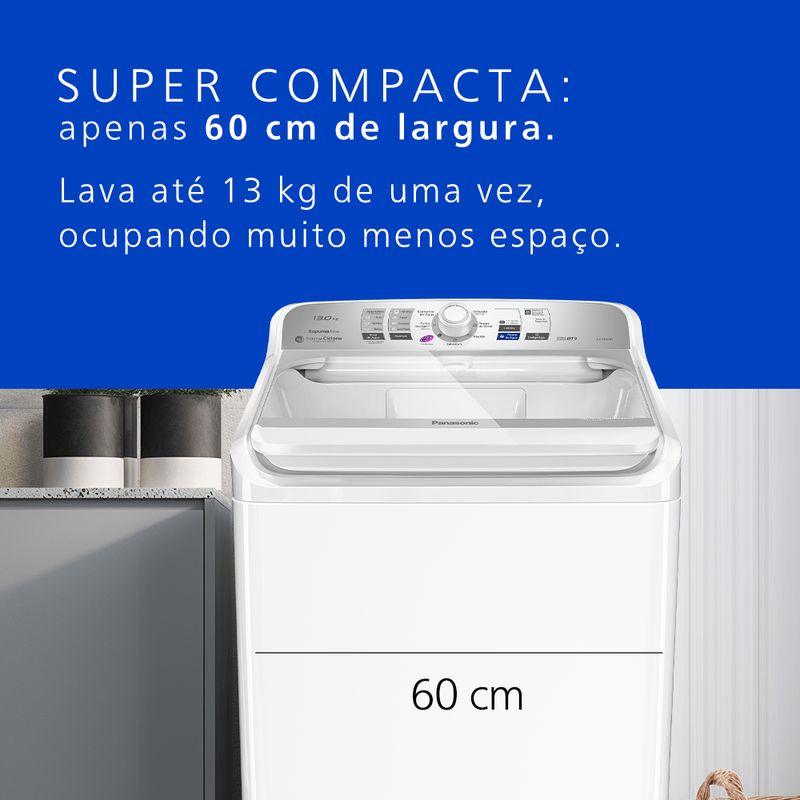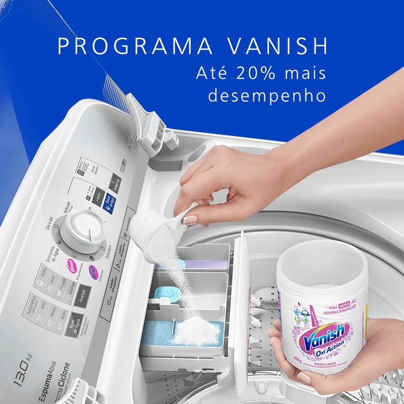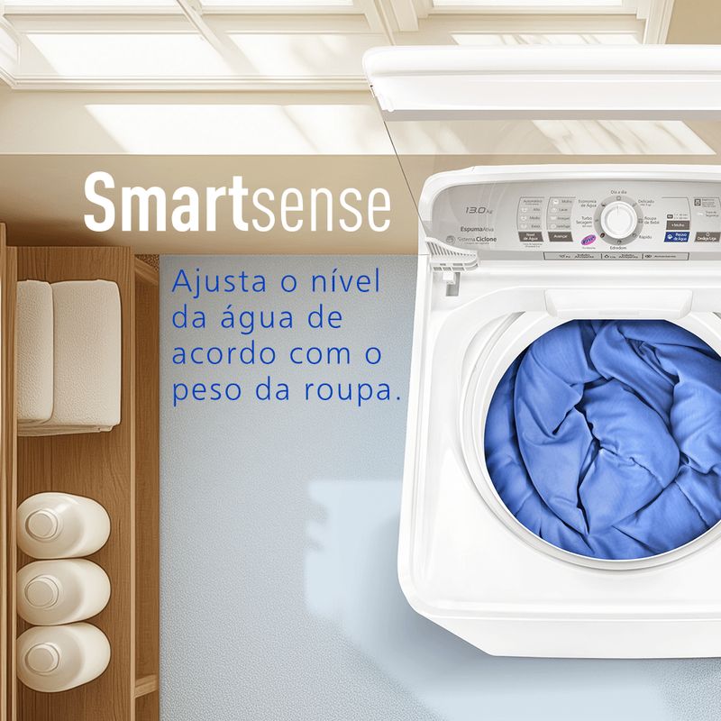 Máquina de Lavar 13 kg na cor branca com a melhor lavagem da categoria segundo o Inmetro. Possui Smartsense, que pesa as roupas e escolhe a quantidade ideal de água, programa exclusivo de lavagem Vanish que melhora o desempenho da lavagem em 20% e super compacta, com 60 cm de largura. Possui filtro de fiapos, cesto em inox, 8 programas de lavagem, a função de reuso de água e Sistema Ciclone de lavagem sem agitador que não danifica as roupas.