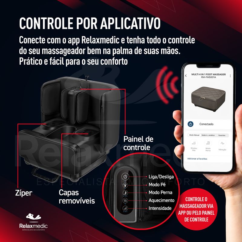 Pelo App Relaxmedic, você controla todas as funções do seu Massageador de Pés Multi 4 em 1!