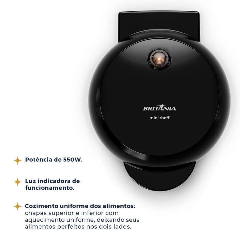 Ideal para quem busca praticidade, a Mini Waffle Maker Britânia é compacta e fácil de armazenar. Além disso, suas resistências superior e inferior garantem que seus waffles fiquem douradinhos e perfeitos dos dois lados.