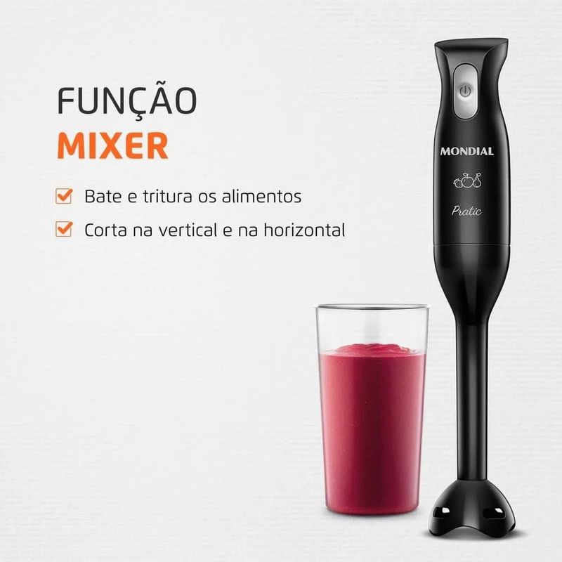 Mais praticidade e eficiência no seu dia a dia com o Mixer Mondial Pratic M-15-B 2 em 1 com Copo Medidor. Compacto, elegante e funcional, ele é perfeito para quem busca desempenho e economia de tempo na cozinha. Com 200W de potência, o M-15-B tritura, mistura e bate alimentos com agilidade, sendo ideal para preparar sucos, vitaminas, sopas, molhos e cremes. Seu design ergonômico proporciona conforto no manuseio, enquanto a função 2 em 1 com copo medidor de 600ml traz mais versatilidade para suas receitas, sem a necessidade de outros utensílios. A haste destacável facilita a limpeza, e o acabamento na cor preta oferece um visual moderno que combina com qualquer cozinha. O Mixer Pratic M-15-B é a escolha ideal para quem procura um mixer potente, acessível e confiável. Garanta o seu e transforme sua rotina culinária com mais sabor e praticidade.
