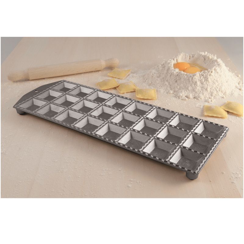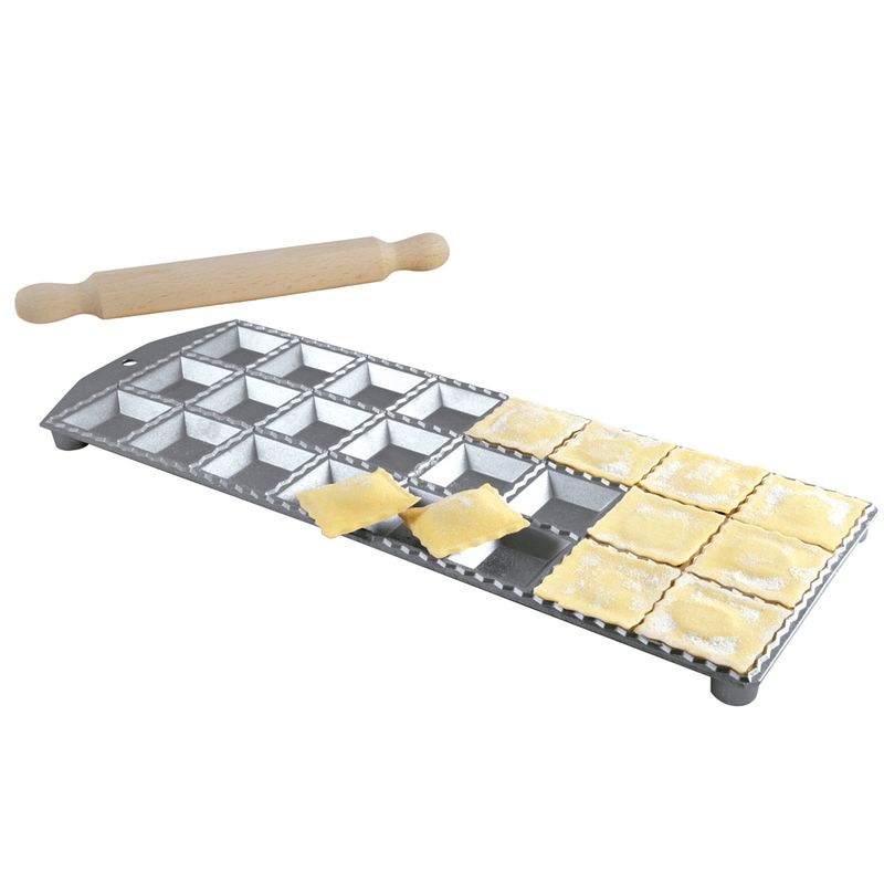 Para fazer o autêntico Ravioli italiano em casa. Feito de alumínio, fácil de usar e limpar. Basta colocar a primeira folha da massa, rechear, colocar a segunda folha da massa e passar o rolo de madeira. Estão cortados, idênticos e prontos para o cozimento.