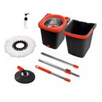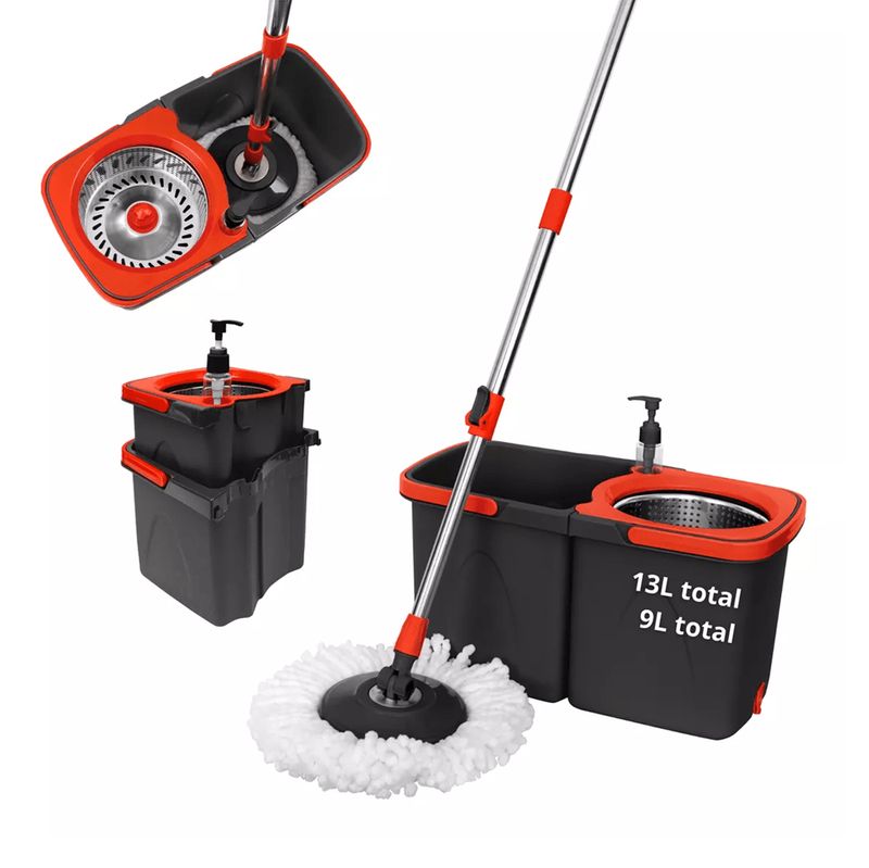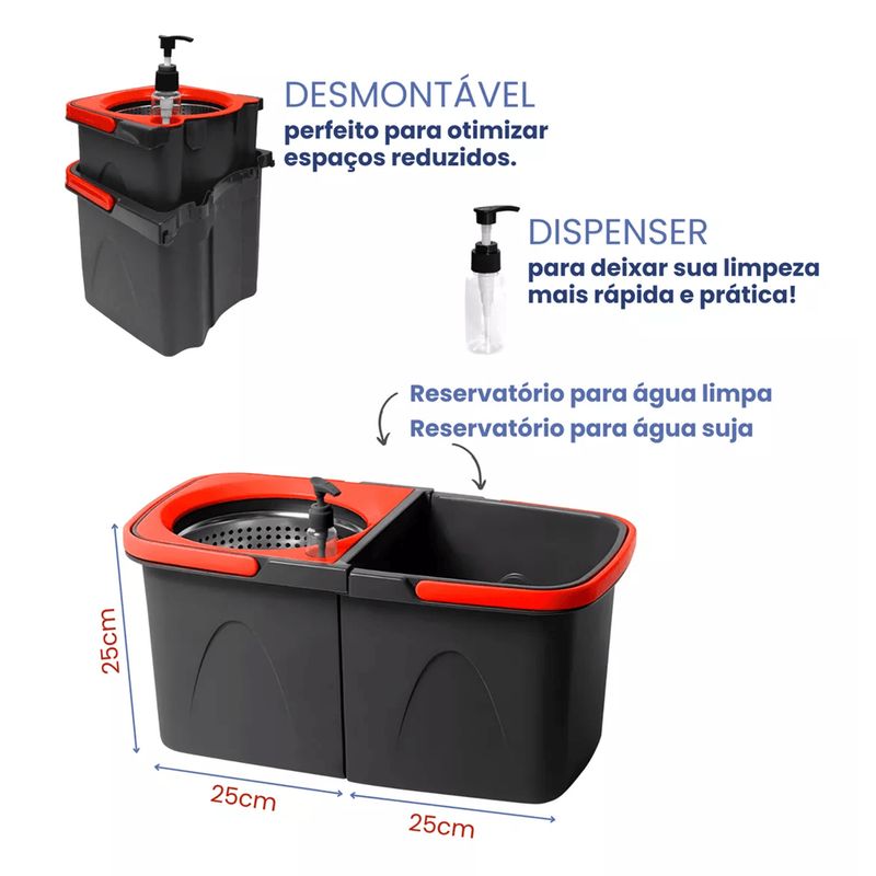 Sua estrutura consiste em dois baldes empilháveis e encaixáveis, permitindo otimização no espaço. Com capacidade total de 13 litros e capacidade de uso de 9 litros, o conjunto de baldes proporciona ampla capacidade de limpeza.