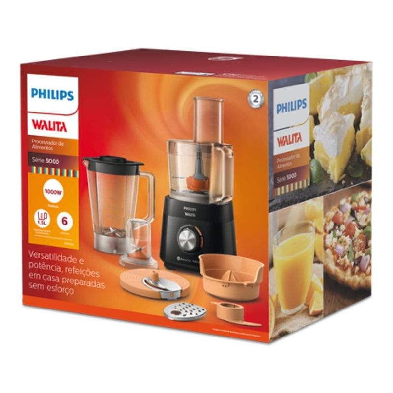O multiprocessador vem acompanhado de 6 acessórios: jarra de liquidificador, lâmina para ralar e fatiar, moedor de grãos, espremedor de frutas, batedor de massas e faca processadora PowerChop. Sua jarra de 1,5L com tampa medidora permite preparar receitas com precisão e praticidade.