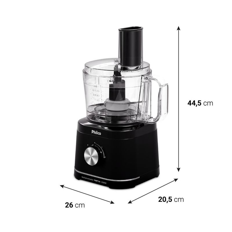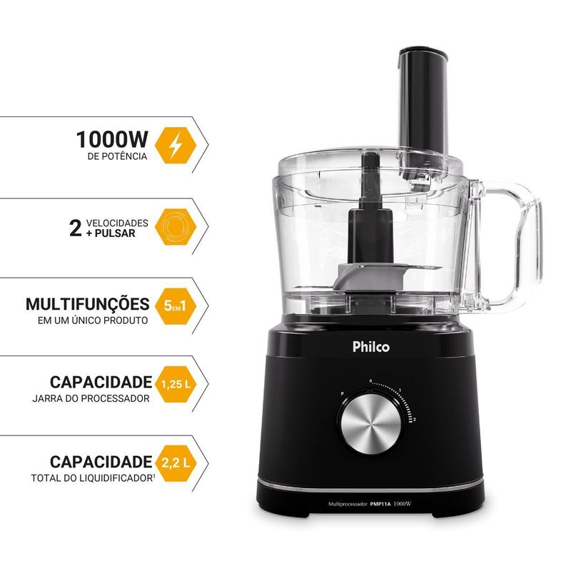 Para quem valoriza durabilidade e performance, as lâminas em aço inox oferecem corte impecável e resistência, e o design compacto integra-se a qualquer espaço. Seja para preparar sucos energéticos após um dia corrido, fatiar ingredientes para eventos ou facilitar seu dia a dia, o Multiprocessador Philco Concept 1000W eleva sua produtividade com resultados profissionais.