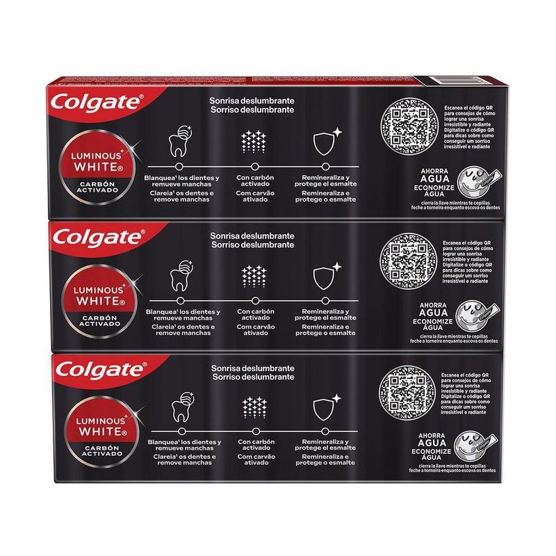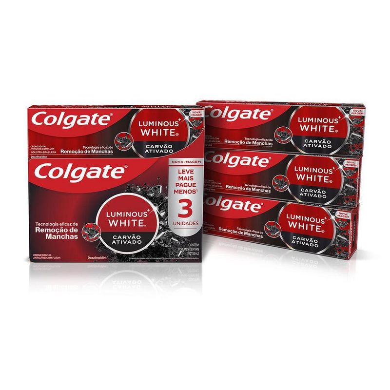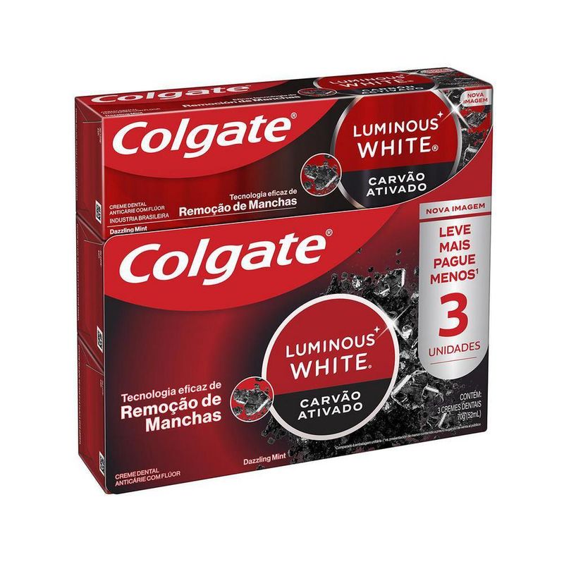 Colgate Luminous White Carvão Ativado possui uma poderosa tecnologia de remoção de manchas para um sorriso mais branco e deslumbrante