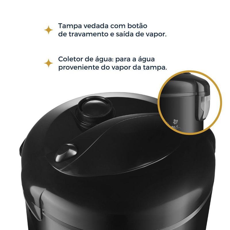E para sua segurança, tampa vedada com alça, botão de travamento, saída de vapor e coletor de água. Ela é perfeita!