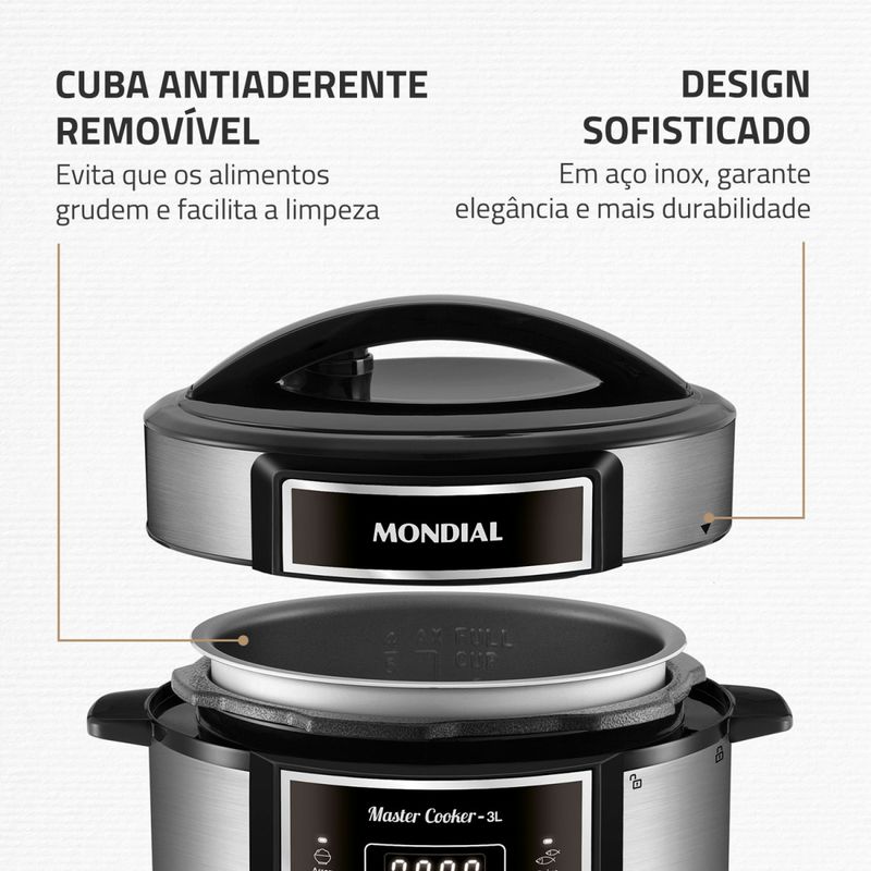 A Panela de Pressão Elétrica Digital Master Cooker 3L Mondial vai trazer muito mais praticidade dentro da cozinha. Possui painel digital com 14 receitas predefinidas, que inicia os preparos com apenas um clique! Você também tem a opção de programar o cozimento automático com até 24 horas de antecedência. Com capacidade de 3 litros, é ideal para o preparo de deliciosas receitas. Saiba mais sobre a PE-40 da Mondial: