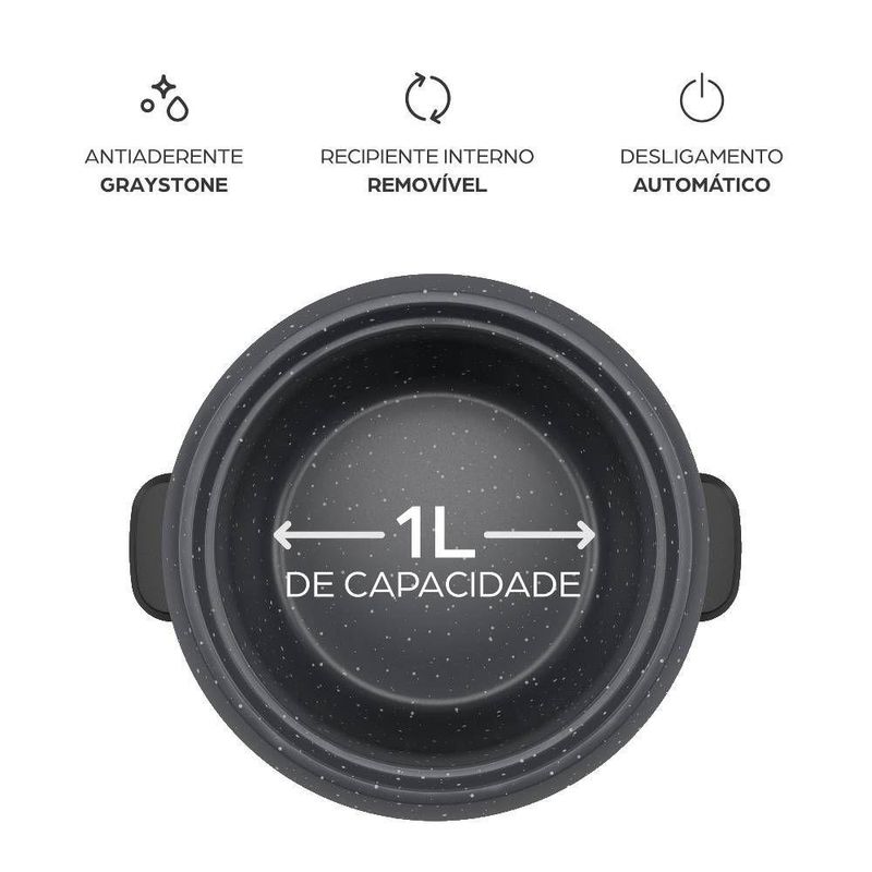 Projetada para facilitar o dia a dia, conta com revestimento antiaderente GrayStone, que evita que os alimentos grudem e torna a limpeza mais simples. A tampa de vidro removível, com saída de vapor, permite acompanhar o cozimento em tempo real, enquanto o desligamento automático e a função manter aquecido garantem praticidade e segurança.
