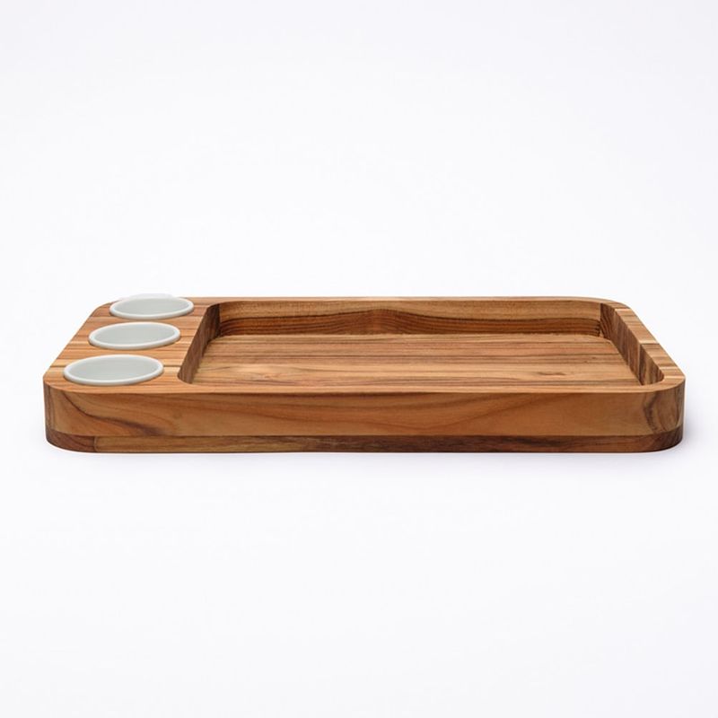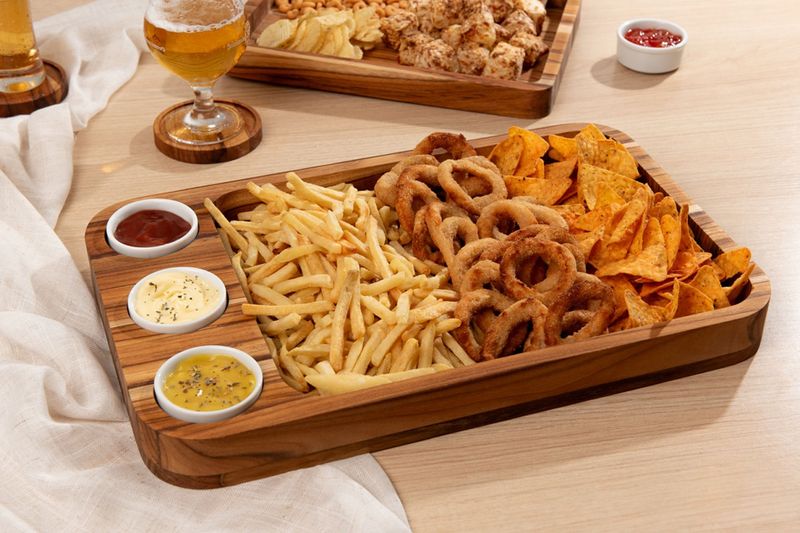 Com suas generosas dimensões de 42x36cm, esta petisqueira oferece ampla área para acomodar uma variedade de petiscos, como queijos, frios, frutas, castanhas e muito mais, permitindo uma apresentação elegante e convidativa dos alimentos. Seu acabamento natural e textura da madeira teca adicionam um toque de rusticidade refinada à sua mesa, enquanto sua superfície lisa e resistente facilita a limpeza e manutenção.