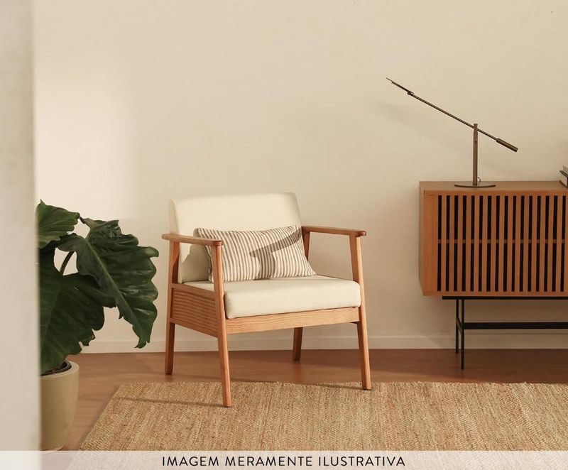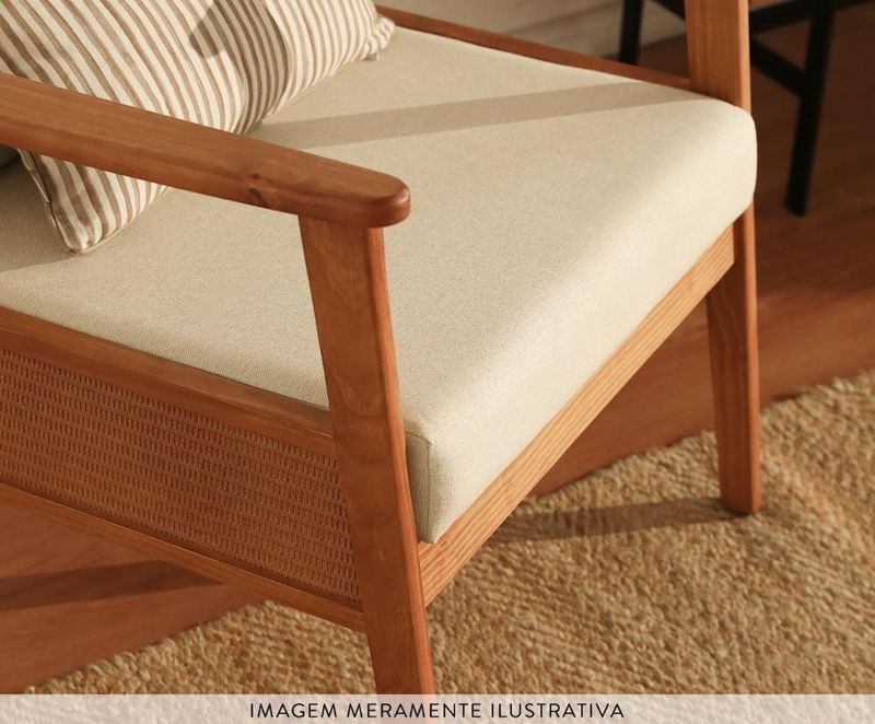 - Poltrona em Madeira de Eucalipto em tom Pitanga e estofado em tecido de linho sintético na cor cinza;