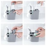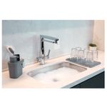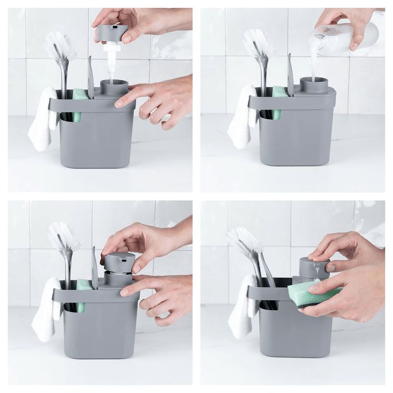Seus detalhes começam no design diferenciado da tampa, que garante um toque mais confortável e base com furos que facilitam o escoamento da água. Além de contar com um recipiente para o detergente, com capacidade para 650ml, o produto permite a organização de vários itens da pia, incluindo esponja, escova, rodo e pano.