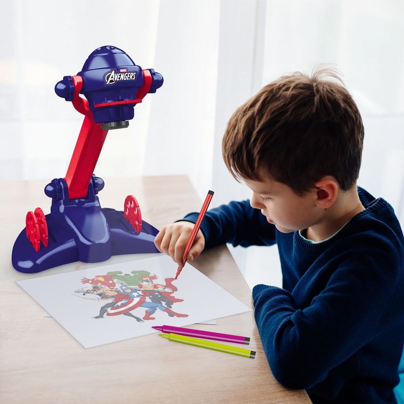 Com 4 discos e 32 desenhos no total, ele permite que as crianças projetem imagens dos super-heróis favoritos da Marvel, estimulando a imaginação e o desenvolvimento artístico.