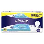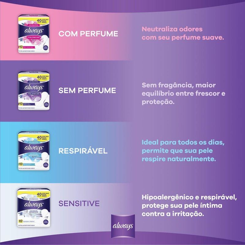 Protetores Diários Always Respirável 80 Unidades Always protetores diários, te ajudam a se sentir limpa e seca todos os dias. Respirável, com exclusivo tecido micro poroso que permite que o ar passe e sua pele respire naturalmente. Ideal para uso diário. • Sinta-se à vontade todo dia com Always protetores diários! • 100% Respiráveis. • Novo formato anatômico que não incomoda. • Canais. Para uma melhor absorção e distribuição. • Adesivo para que não se mova. *Compre Produtos Always.