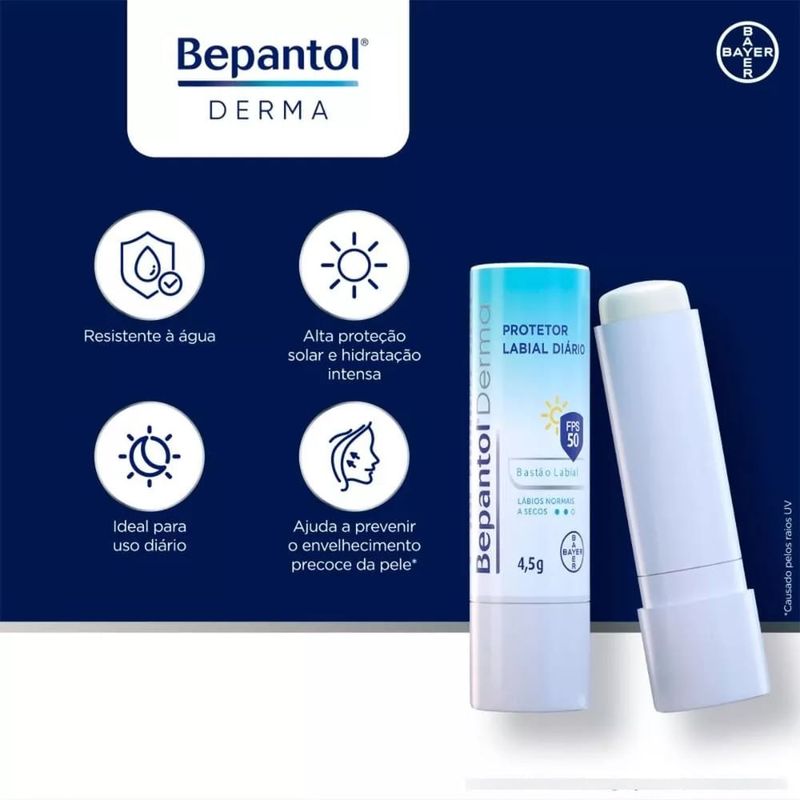 - Conteúdo da Embalagem: 1 Protetor Labial Diário FPS 50 Bepantol