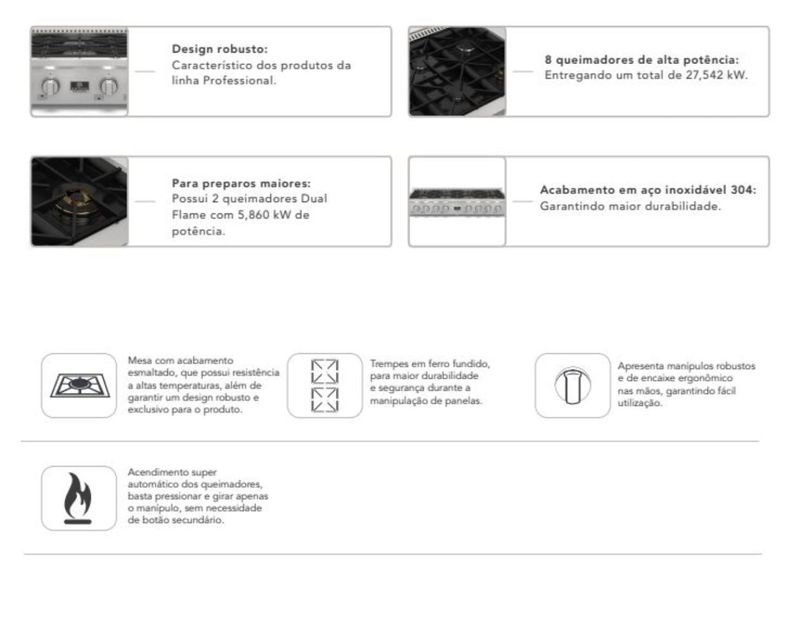 Novos Rangetops Professional são robustos com design inspirado nos modelos americanos. Podem ser instalados nas bancadas de cozinhas e áreas gourmet, combinando com outros equipamentos da linha Professional Elettromec. O modelo de 48 Polegadas possui 8 queimadores de alta potência, acabamento em aço em 304 e acendimento super automático.