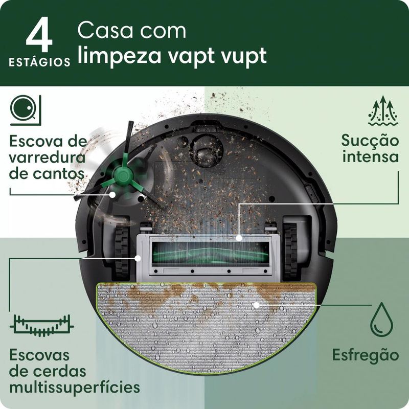 Graças à sua sucção significativamente ampliada (até 70 vezes mais em relação à referência da série anterior) ele capta poeira, pelos, sujeira fina e detritos maiores com eficiência superior.A combinação “aspirar + passar pano” permite que pisos duros, como porcelanato, madeira ou vinílico, fiquem com acabamento limpo e seco.