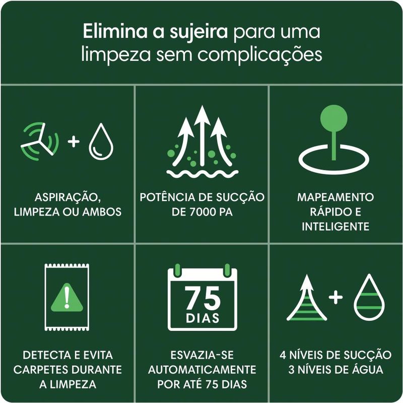 Destaques principais Esvaziamento automático: armazena sujeira por até 75 dias sem intervenção.