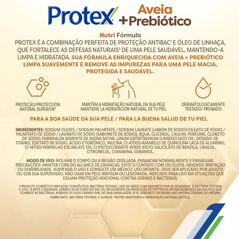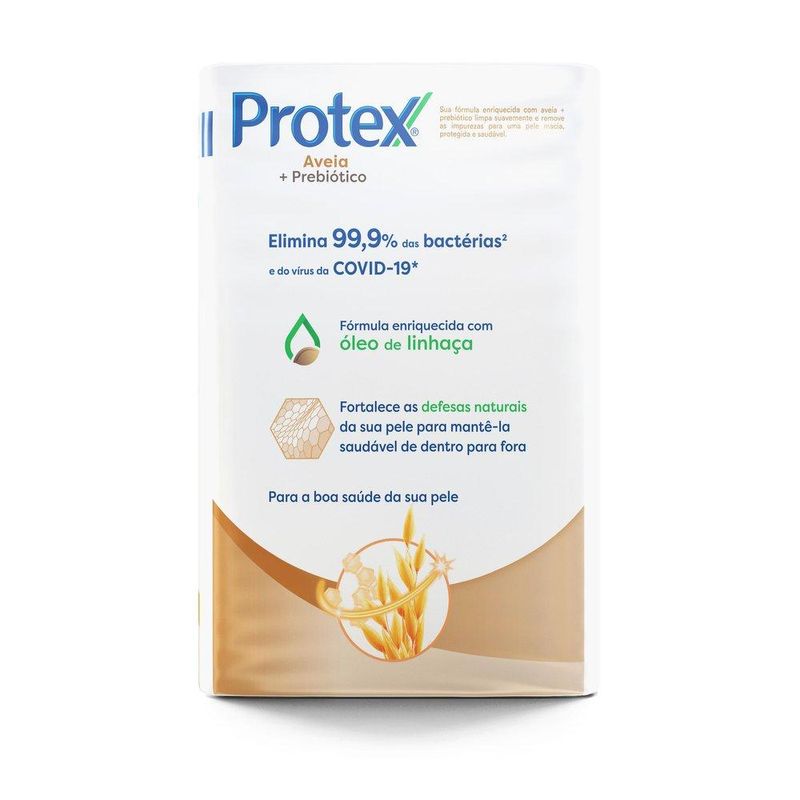 Protex® Aveia e Prebióticos cuida da pele do corpo e do rosto, ajudando a remover a oleosidade da pele, sem ressecá-la. Oferece proteção antibacteriana natural com óleo de linhaça e Elimina 99,9% das bactérias* naturalmente, mantendo você protegido por até 12h**.