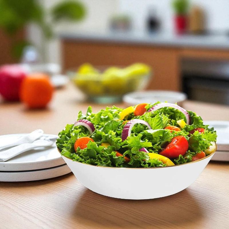 Fabricada em porcelana, a saladeira se destaca pelo seu tom branco puro e pela sua durabilidade, oferecendo a base ideal para que seus alimentos ganhem destaque na mesa. O grande diferencial está no delicado e brilhante friso ouro que adorna a borda, adicionando um toque de luxo e charme atemporal.