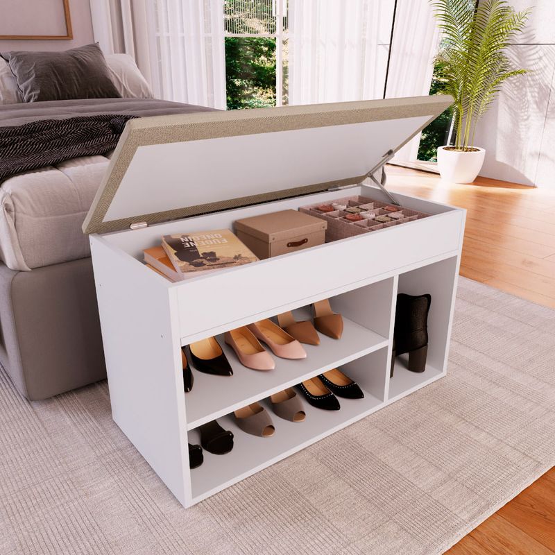 A Sapateira Baú Branco com Tampo Estofado da Completa Móveis é um produto versátil, ideal para organizar seu lar e valorizar a decoração da sua casa com grande estilo, pode ser utilizada em ambientes como: dormitório e hall de entrada. No dormitório, ideal para cama de solteiro, mas, podendo ser utilizada perfeitamente com cama de casal. Praticidade em guardar seus calçados e facilitando quando da colocação dos mesmos. Baú com tampo estofado o qual prático e confortável, bom para guardar não somente acessórios pros calçados, mas tmbém livros e outros pertences. Como hall de entrada, ideal para as mesmas praticidades e funções do seu quarto, além do charme e decoração!