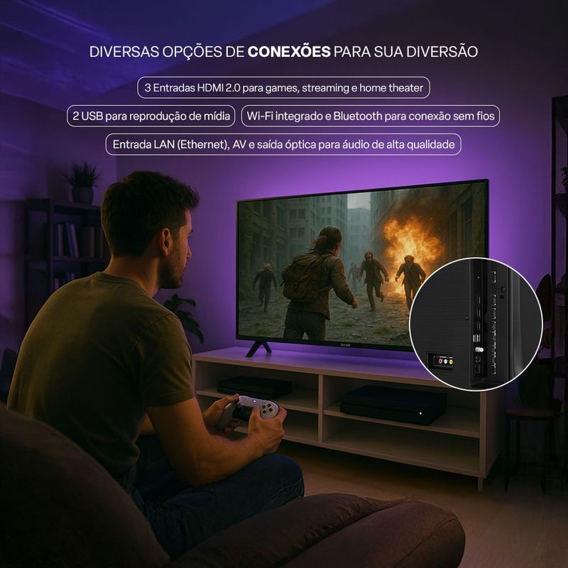 Você desfruta de uma conectividade completa com wi-fi e diversas entradas que permitem conectar seus dispositivos favoritos: 3x HDMI 2.0; 2x USB 2.0; 1x AV; 1x entrada P2; 1x Óptica; 1x conversor digital; 1x Lan Ethernet.