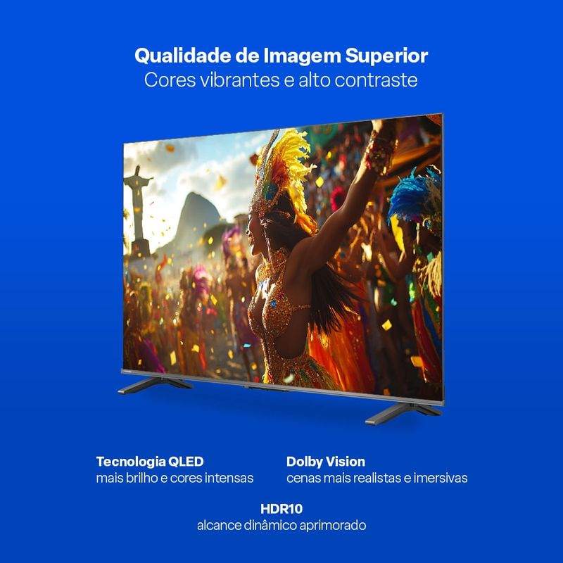 A tecnologia QLED e a resolução 4K proporcionam um brilho preciso e uniforme, com cores vibrantes e detalhes nítidos, oferecendo uma experiência visual de alta qualidade.