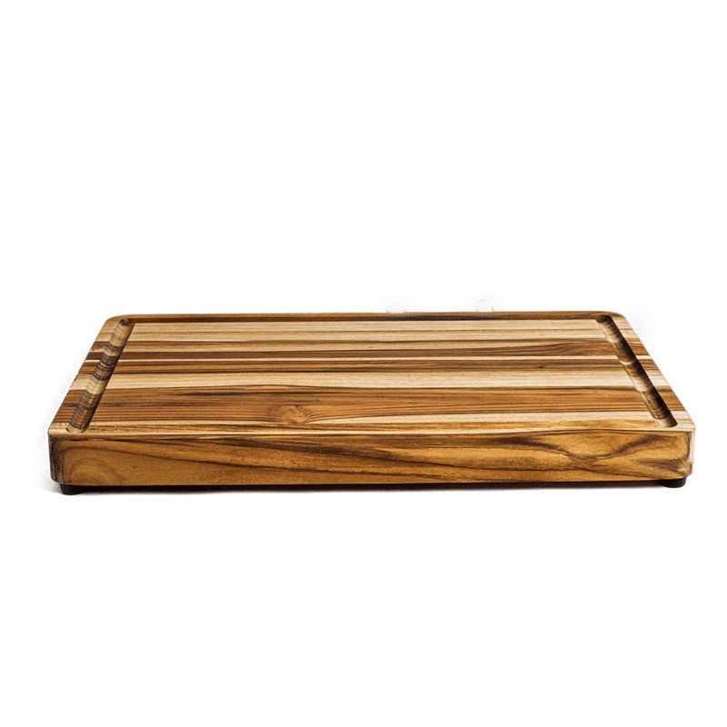 Este modelo possui canaletas/sulcos laterais que auxiliam na hora de cortar e servir, evitando que eventuais líquidos escorram com facilidade. A tábua possui ainda 4 pezinhos emborrachados e removíveis (que podem ser retirados caso prefira usar sem).