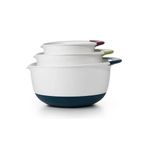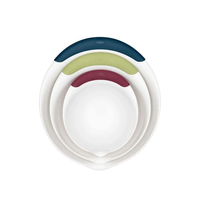 Produzido pela Americana OXO Good Grips, excelente conjunto de tigelas em plástico de alta qualidade, com alças macias e fundo antiderrapante. Conjunto de 3 tigelas em tamanhos diferentes para auxiliar no preparo de massas, saladas, ou servir direto à mesa. Alças coloridas e macias e fundo antiderrapante que garantem conforto e segurança no manuseio. Design diferenciado com bico inteligente para a retirada do alimento evitando que haja desperdício e sujeira.