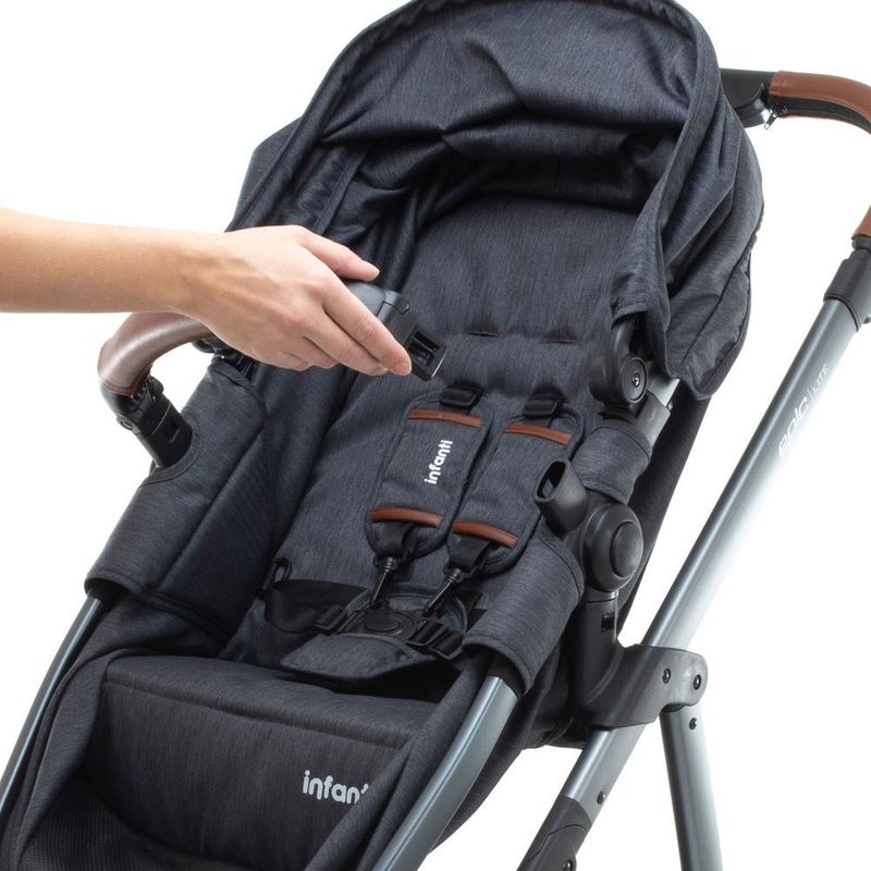 Manopla com Ajuste de Altura e Barra Frontal Removível: Facilita o manuseio e acesso ao bebê.