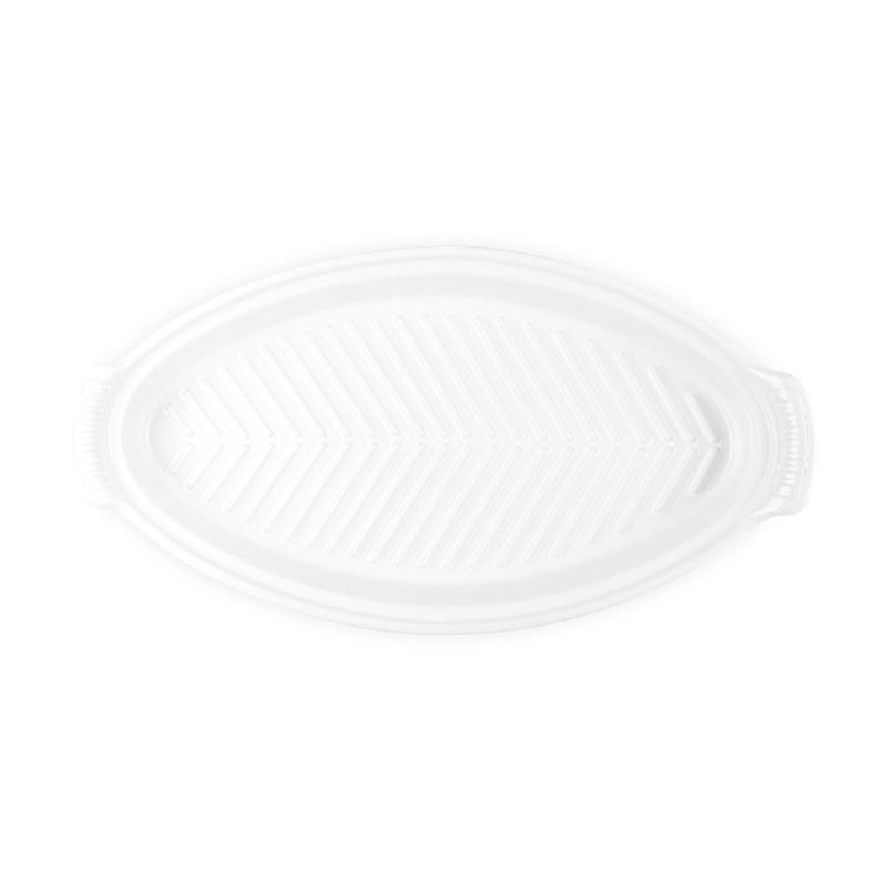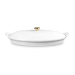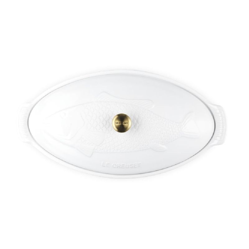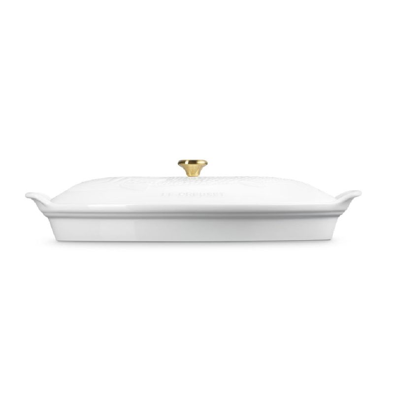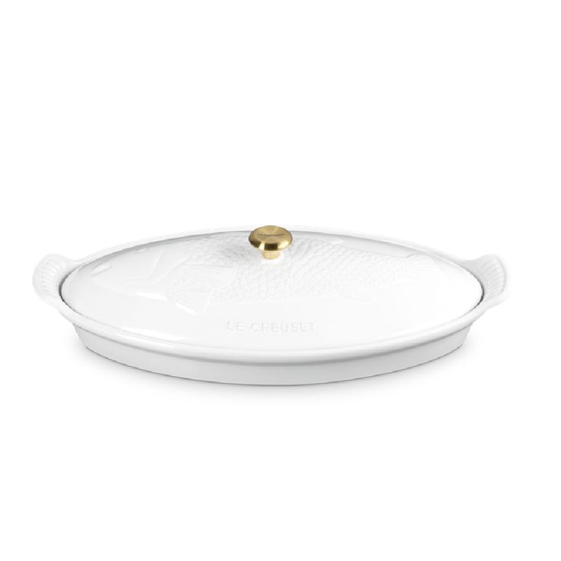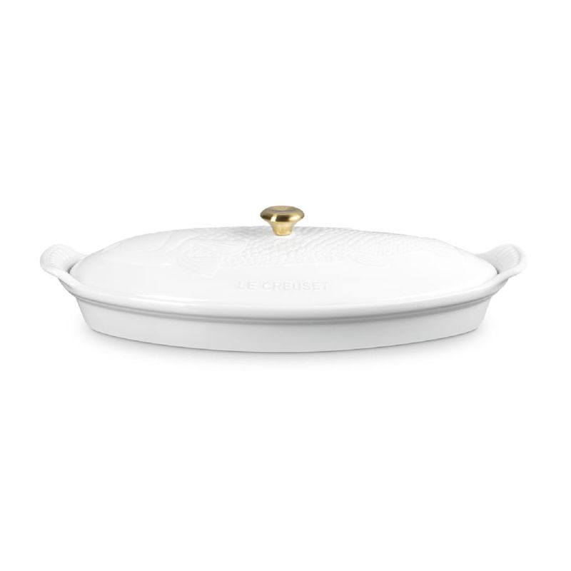 Essa travessa em relevo apresenta uma elegante arte de peixe e um puxador dourado para uma apresentação marcante. É ideal para assar e cozinhar peixes no vapor, bem como para assar e cozinhar legumes e carnes no vapor, refeições individuais e muito mais. As ranhuras elevam os alimentos para um cozimento uniforme, enquanto a tampa retém a umidade