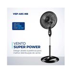 O ventilador Super Power VSP-40C-NB possui 40 cm de diâmetro e hélice com 6 pás, garantindo um ambiente mais refrescante e agradável. Já o sistema de ventilação da Mondial apresenta baixo nível de ruído e assegura o silêncio necessário para momentos de concentração e uma excelente noite de sono. A linha de Ventiladores Super Power possui 40cm de diâmetro e 6 Pás. O design, aliado à potência, promove maior intensidade do vento e é garantia de um ambiente fresco e agradável.